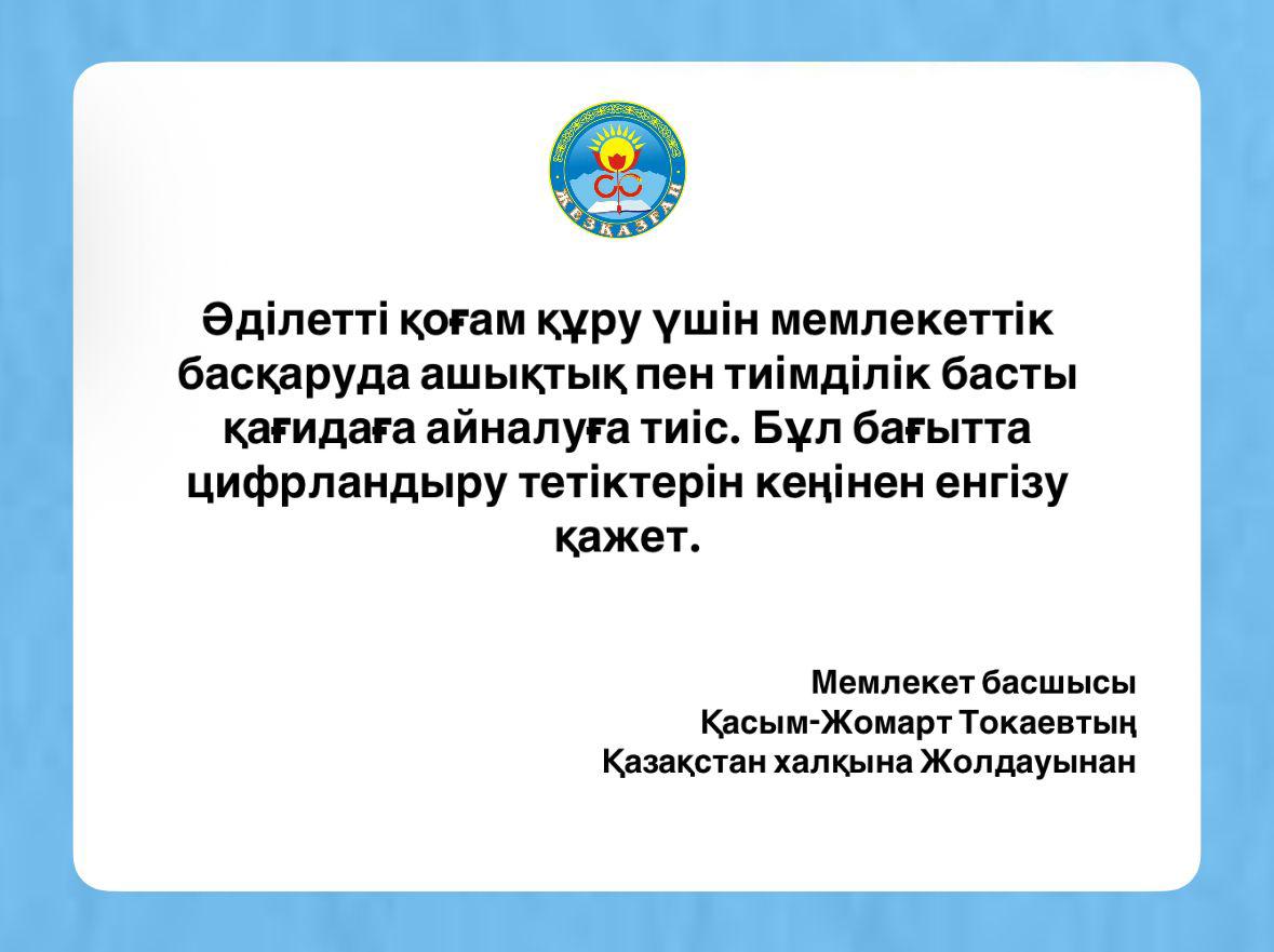 Президент Қасым-Жомарт Тоқаев өз Жолдауында әділетті қоғам қалыптастыру үшін мемлекеттік басқаруда ашықтық пен тиімділік басты қағидаға айналуы қажет екенін ерекше атап өтті. Бұл мақсатқа жету жолында цифрландырудың рөлі айрықша.