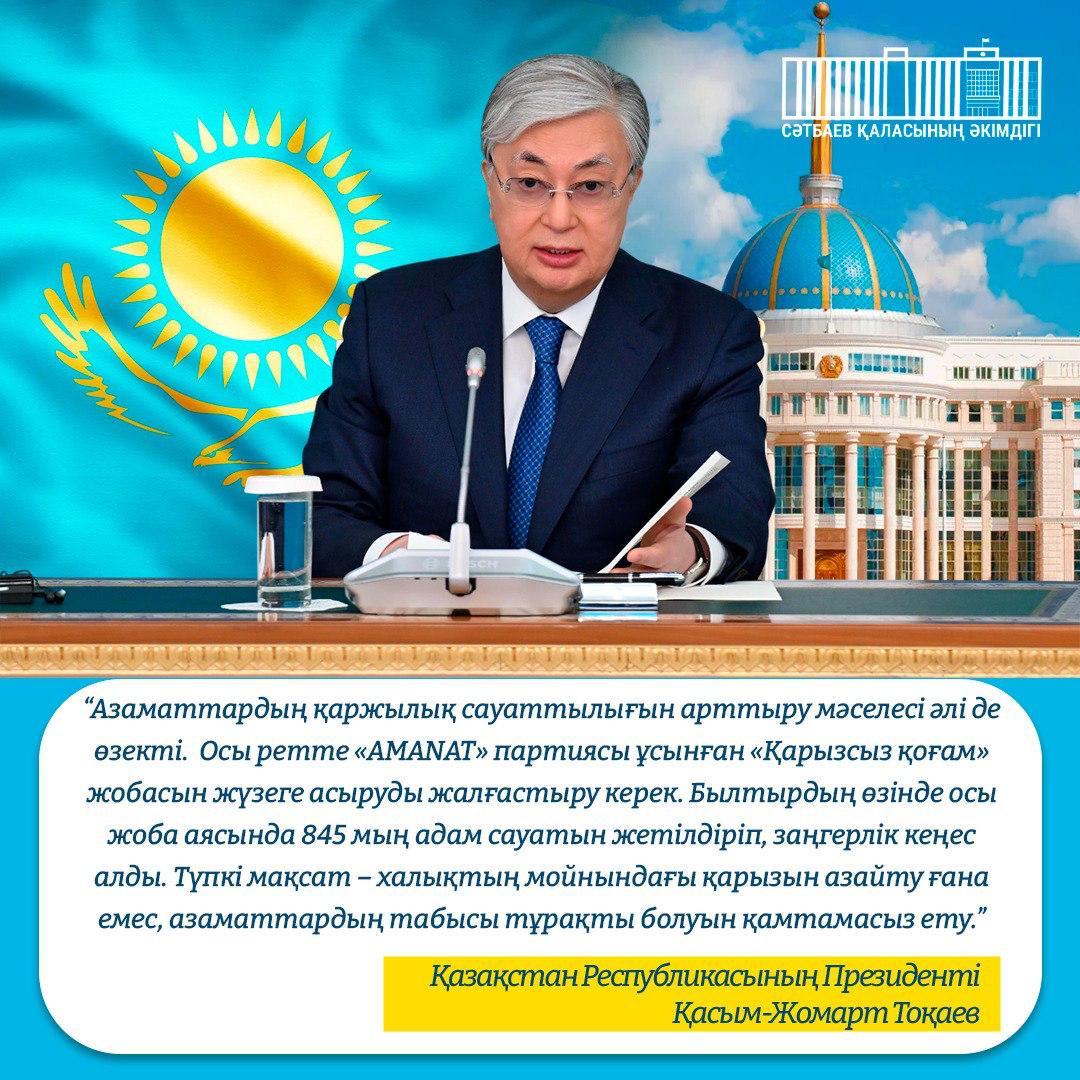 Азаматтардың қаржылық сауаттылығын арттыру мәселесі әлі де өзекті. Осы ретте «АМАНАТ» партиясы ұсынған «Қарызсыз қоғам» жобасын жүзеге асыруды жалғастыру керек. Былтырдың өзінде осы жоба аясында 845 мың адам сауатын жетілдіріп, заңгерлік кеңес алды. Түпкі мақсат — халықтың мойнындағы қарызын азайту ғана емес, азаматтардың табысы тұрақты болуын қамтамасыз ету.