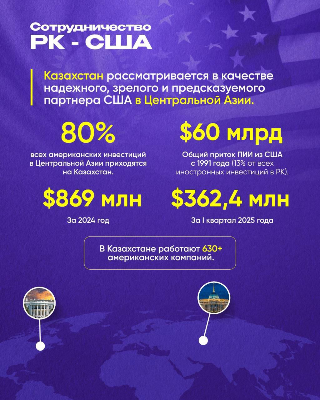Қазақстан мен Америка Құрама Штаттарының арасындағы стратегиялық серіктестік соңғы жылдары айрықша серпін алып, жаңа экономикалық мүмкіндіктерге жол ашуда. АҚШ Қазақстанды Орталық Азиядағы ең сенімді, кемел және болжамды әріптестердің бірі ретінде қарастырады. Бұл өзара сенім екі ел арасындағы инвестициялық байланыстардың артуына, ірі жобалардың іске асуына және жеке сектордағы ынтымақтастықтың кеңеюіне тікелей ықпал етіп отыр.
