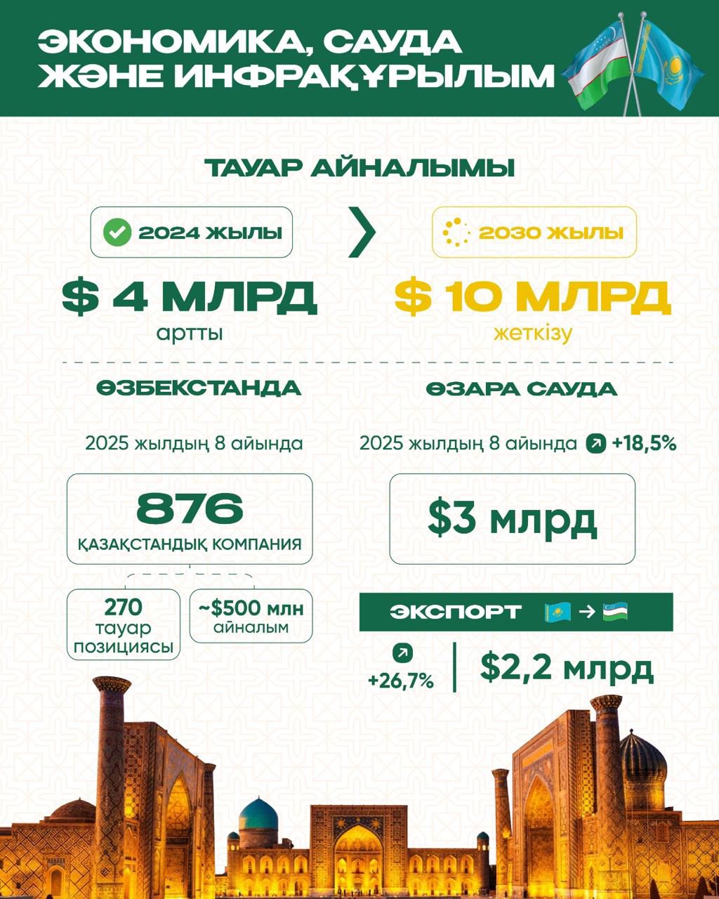Қазақстан мен Өзбекстан арасындағы сауда-экономикалық байланыстар қарқынды дамуда. 2024 жылы екіжақты тауар айналымы 4 млрд АҚШ долларына жетіп, айтарлықтай өсім көрсетті. Екі елдің стратегиялық жоспарына сәйкес, бұл көрсеткішті 2030 жылға қарай 10 млрд долларға жеткізу міндеті қойылған.