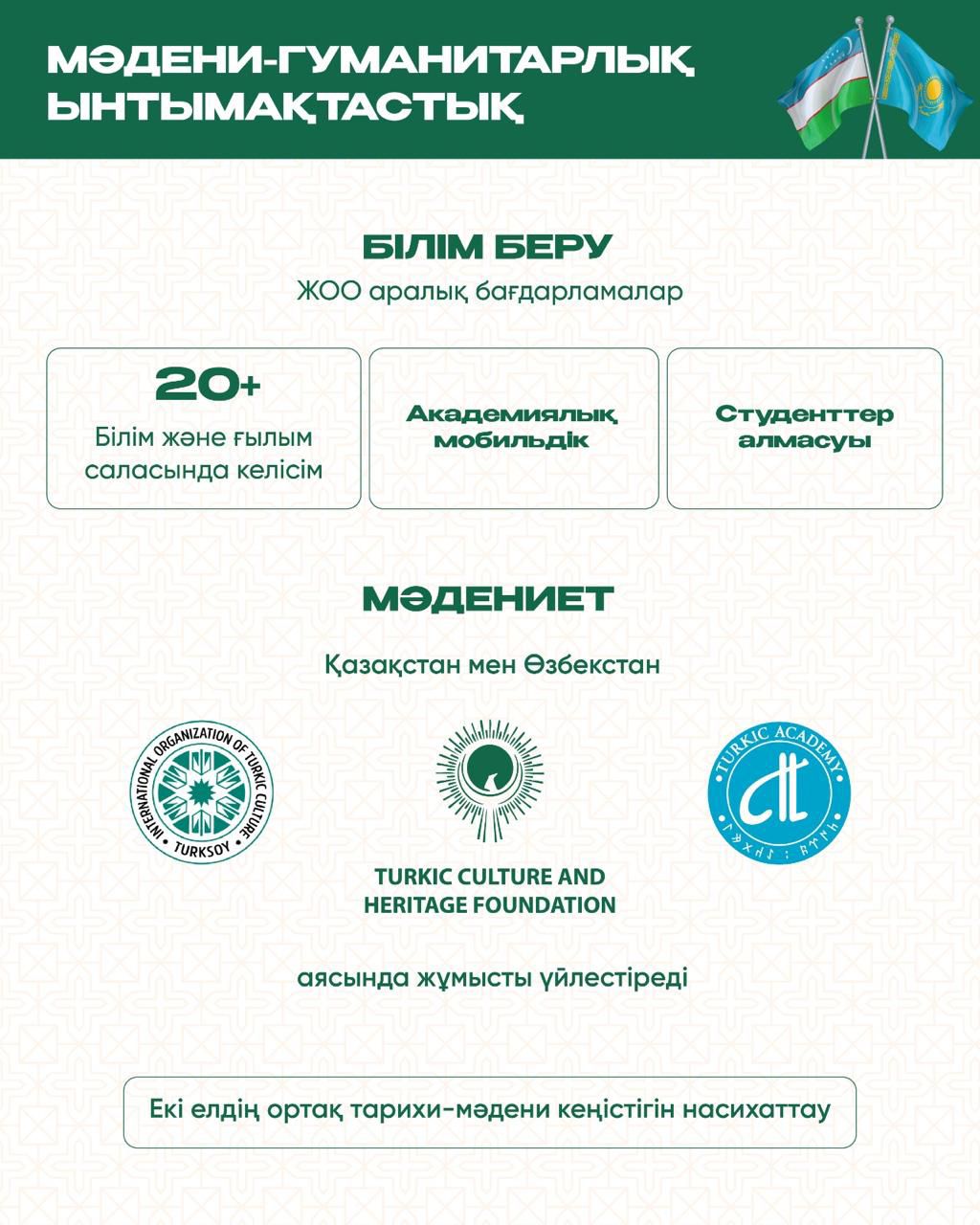 Қазақстан мен Өзбекстан арасындағы қарым-қатынас соңғы жылдары жаңа серпін алып, әсіресе мәдени-гуманитарлық салада кеңейіп келеді. Екі елді ортақ тарих, рухани мұра және бауырлас түркілік мәдениет біріктіреді. Сондықтан да білім, мәдениет және ғылым салаларындағы ынтымақтастық өзара түсіністік пен тұрақты серіктестікті нығайтудың маңызды факторы болып отыр.