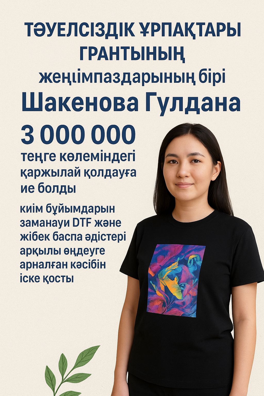 Бұл қаражаттың көмегімен ол киім бұйымдарын заманауи технологиялар арқылы өңдеуге бағытталған кәсібін бастады. Гүлдана өз ісінде DTF және жібек баспа әдістерін қолданып, жоғары сапалы, ерекше дизайндағы өнімдер шығаруда. Мұндай әдістер қазіргі уақытта сән индустриясында үлкен сұранысқа ие және киім сапасын арттырумен қатар, отандық брендтердің дамуына жол ашады.