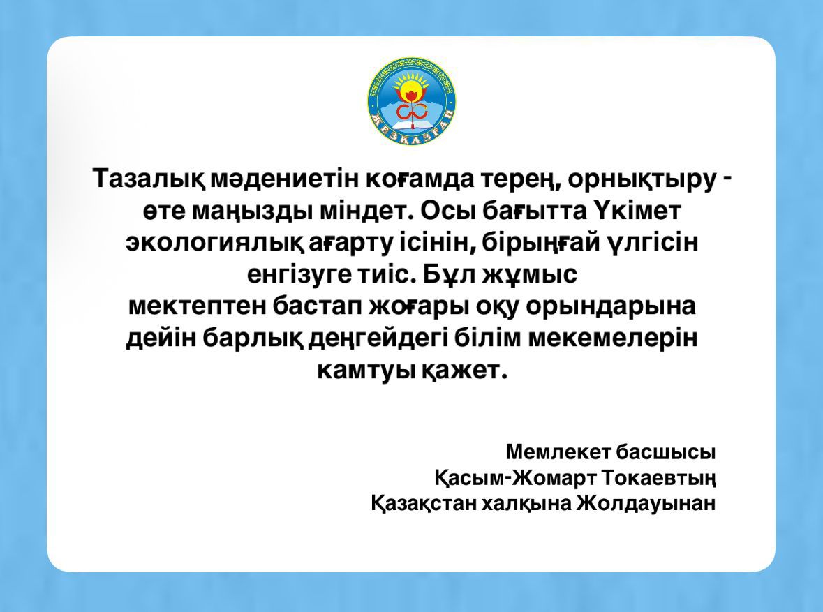 Мектеп пен оқу орындарының да рөлі зор. Білім беру мекемелерінде экологиялық мәдениетті, қоршаған ортаны қорғауға деген жауапкершілікті арттыратын арнайы сабақтар, жобалар, іс-шаралар көбірек ұйымдастырылса, жастардың сана-сезімі жоғары деңгейде қалыптасады. Оқушыларға табиғатты таза ұстаудың маңызын түсіндірумен қатар, өздері қатыса алатын экологиялық акциялар өткізу – тәрбиенің ең тиімді жолы. Өйткені адам өзі іс жүзінде орындаған әрекеттер арқылы ғана шынайы дағдыларды қалыптастырады.